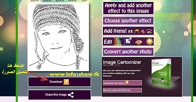 هذه هي نتيجة الصورة التي قمت باختيارها أنا شخصيا تحويلها إلى مرسومة ، بعد ذلك تقوم بتحميلها عبر الضغط على زر Download كما هو واضح في هذه الصورة